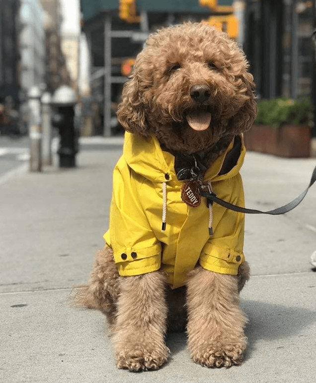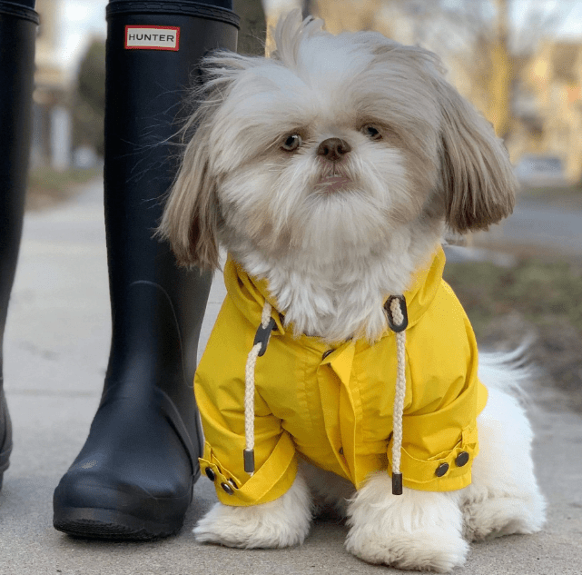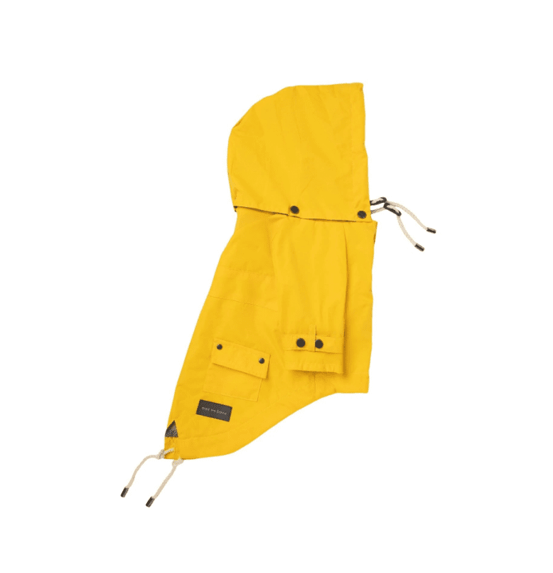 Details: a sturdy snap-off hood, adjustable cuffs, drawstrings and flap pockets – can be usable during showers – without ruining pup’s hair.
